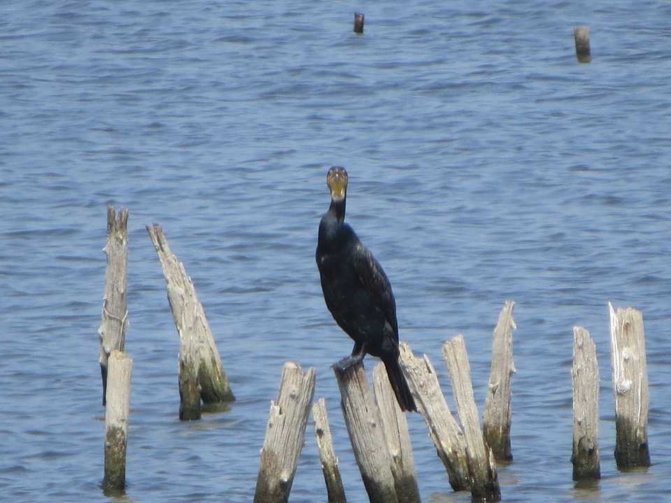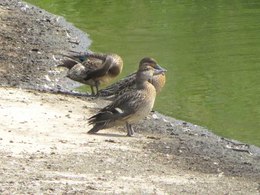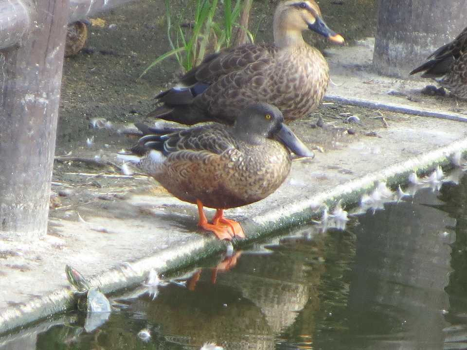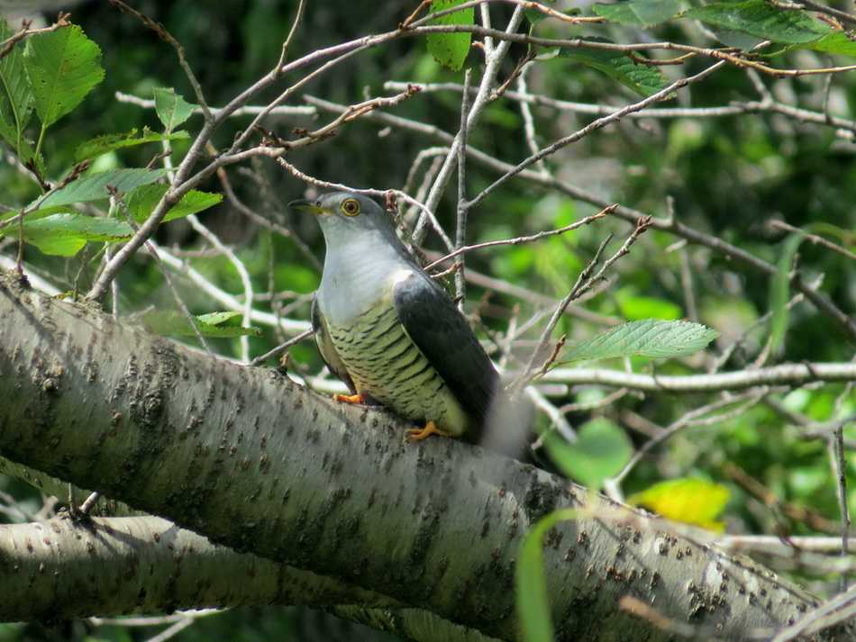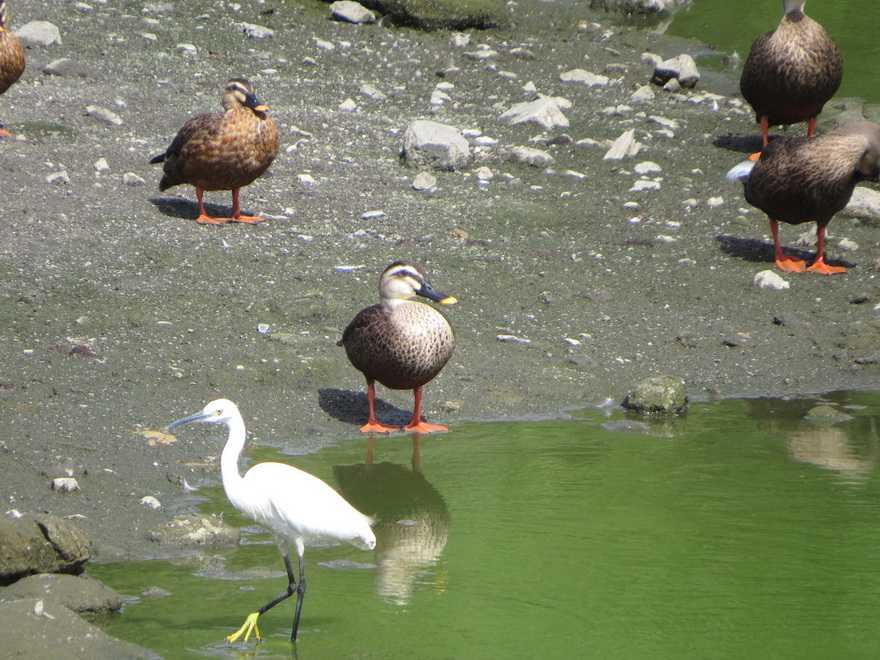 お天気が不安定で、時折雨が降るとの予報でしたので、コンパクトに探索ができて雨宿りも可能なフィールドの舎人公園を訪ねました。広さ65haの公園のうち、東側エリアをメインに鳥たちの姿を探しました。(ツツドリとツミの姿を発見)花見広場と芝生広場の一角でツツドリ赤色型2羽、ツミ幼鳥3羽を発見しました。ツツドリは、上面の地が赤褐色で、胸の縞模様は太いこと、下尾筒に横斑がありました。しかし、カラスに追尾されて林の一角の木の中に退避してきたので、撮影はかなわず。(カルガモとマガモの交雑個体)大池では、カルガモ9羽、カルガモとマガモの交雑個体12羽の姿がありました。上面が暗褐色で下尾筒の色などはカルガモの特徴がありますが、嘴は黄色で過眼線はうっすらで過眼線はカルガモに比べて細い個体、体全体が白っぽく、頭央線が薄く太い眉斑がない個体など実にいろいろな個体と出会いました。マガモとカルガモの交雑は、形態や生態が似ているおり、たやすく交雑すると言われています。外見が親鳥のどちらかと似ていたり、あるいは中間的な特徴を持っていたりします。(その他、観察できた鳥たち)頬から後頭部が赤褐色のカイツブリ夏羽、ツツドリ、ツミ幼鳥を追尾していたハシブトガラス、地面でひたすら餌探しに余念のなかったハシボソガラスの群れを観察しました。(これから秋、楽しみな出会い)これから10月にかけて、小鳥たちが立ち寄っていくと思います。次の訪問が楽しみです。(写真)2025年9月13日撮影