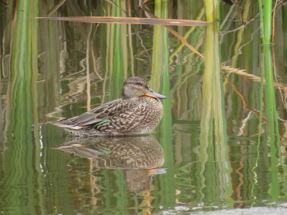 柏の葉キャンパス駅東口と西口の調整池を探索しました。東口の商業施設前の調整池ではバン成鳥、若鳥、幼鳥の三世代の姿がありました。若鳥が成鳥のヘルパーとして幼鳥の世話をしていところを観察できたらよかったのですが、遭遇はかないませんでした。また、カルガモが水面に広がる藻の中で嘴で濾し取って採餌している姿も観察しました。このほか、高層住宅の一角でイソヒヨドリが囀り、上空をサシバが旋回する姿も発見。その後、西口の調整池に移動し、周囲を見て回りました。アオサギ、そしてコガモの姿を見つけました。コガモは頭頂から過眼線までがヘルメットを装着したように一様に濃く、嘴の基部側面に黄色味があるのを観察しました。しかし、記録撮影しようとトライしましたが、身長以上に高さのある草がレンズ前を隠してしまい、コガモの2枚のうち1枚はかろうじて特徴がわかる程度のもの、もう一枚も斜め正面から姿を記録するのがやっとでした。(写真)2025年9月7日撮影