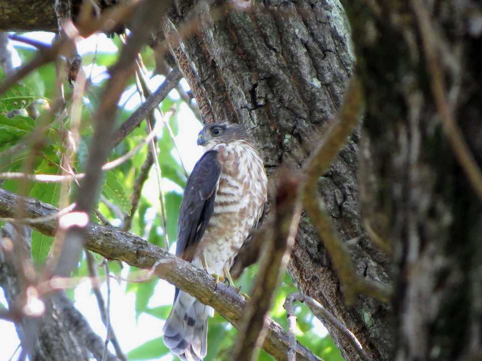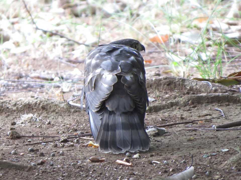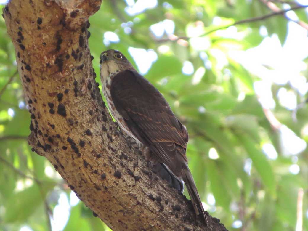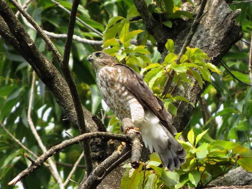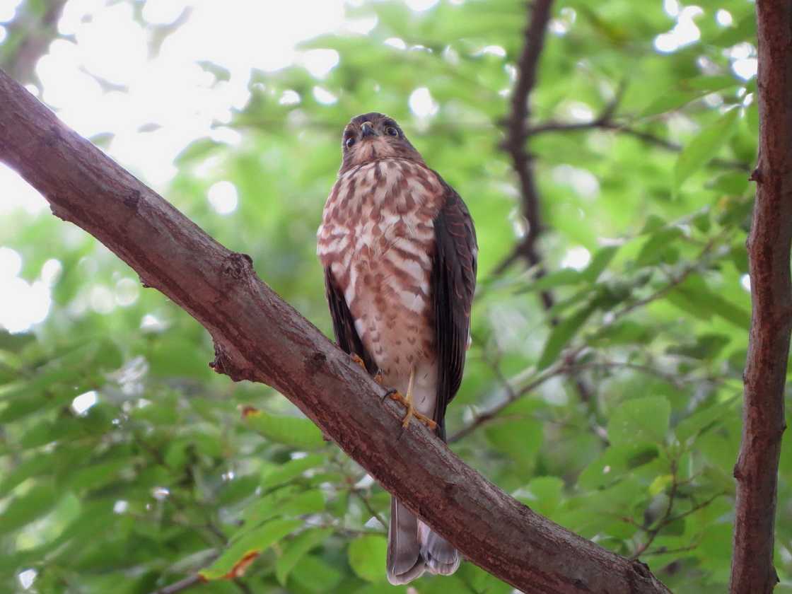 (林内を活発に行動するツミ幼鳥)鳥友の町でカラスの古巣を使って産卵し、雛が誕生し順調に成長を続け、23日にはすべての幼鳥が巣立ちました。これまでに経験したことのない酷暑の中、幼鳥たちは林の残っている4羽がそれぞれの木の枝に止まり、クゥクゥとかビービーと鳴き声を上げコミュニケーションを取っています。2羽が同時に空中に飛び立ったと思ったら、セミを捕獲。1羽は、木の幹でセミの解体をはじめ、羽をきれいにとったり後、身をついばんでいました。もう1羽は、地面にセミを追い詰めて足で押さえつけて解体し、食べていました。食べ終わった後、きれいにとられたセミの羽が落ちていました。(セミと昆虫とツミ)セミの姿が見えなくなると、幼鳥たちはセミの探して近郊に移動していきます。森岡ほか(1995)が報告しているに、セミ以外の昆虫類がいなくなると、渡りをすると言われています。いつまで林での行動が観察できるかと注視しています。幼鳥たちは、木の横枝に止まり獲物を探したり、飛びながら餌を捕獲したり、枝に止まっている小鳥をさらうように捕獲する光景も見かけます。林内を飛翔するスピードも成鳥並となって迫力すら感じるようになってきています。(餌を食べ終わると日光浴)幼鳥たちは餌を食べ終えると、幹に止まり平べっくなり日光浴するもの、軽業師のように枝に止まり翼を広げて日光浴をするものといろいろ。(写真)2025年8月30日撮影(4枚目のみ2010年7月に千葉県内で撮影)(引用)森岡照明・叶内拓哉・川田隆・山形則男.1995.日本のワシタカ類.p118-119.文一総合出版.