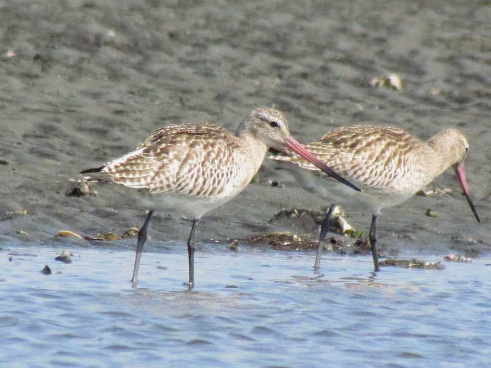 鳥友から秋の三番瀬で見かけるオオソリハシシギは、若鳥が多いがどうしてかと質問をもらいました。(オオソリハシシギは、成鳥が越冬地に向かった後に幼鳥が出発)シギ・チドリは秋では繁殖を終えた成鳥が越冬地に向かって渡り始め、その後幼鳥が旅立つ言われています。しかも、幼鳥と成鳥の渡りルートが違うとも耳にしています。これに対して、オグロシギは成鳥と幼鳥の比率も偏りが少なく、渡りのルートが違うということはないと考えられています。(オオソリハシシギとオグロシギ幼鳥について)オオソリハシシギは、嘴が長く、上に反っていることから識別は容易と思われる方がいらっしゃいます。しかし、嘴の反りに個体差があり、オグロシギ似で嘴が真っすぐに見える個体を見かけることがあります。オグロシギとの識別に注意が必要です。(1)オオソリハシシギオオソリハシシギ幼鳥は、全体に淡い灰褐色を帯びて胸・腹部に褐色の縦斑があります。また、肩羽や三列風切の軸斑の先は尖り、上面各羽の羽縁はオグロシギ幼鳥より白味が強い印象があります。(成鳥では翼羽縁は先端が尖った笹の葉状ですが、幼鳥ではオグロシギのように先端が丸くなっています)(2)オグロシギオグロシギ幼鳥は頭部から背、頸から胸・腹部に橙色味を帯びます。肩羽の黒褐色の軸斑はオオソリハシシギ幼鳥に比べて黒味が強く、軸斑の先は尖らず丸味があります。また、羽縁も橙色味を帯び、雨覆・三列風切に黒褐色斑と橙色斑の模様があります。(写真)オオソリハシシギ、一枚目、二枚目:2013年9月21日三番瀬、オグロシギ、三枚目:2018年9月22日茨城県稲敷市、四枚目;2018年10月6日茨城県稲敷市