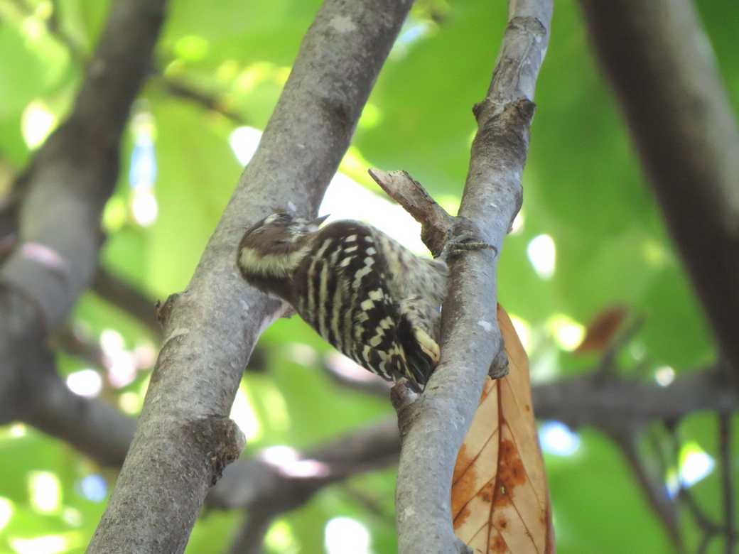 鳥友の町でカラスの古巣を使って産卵し、雛が誕生し順調に成長を続け、23日にはすべての幼鳥が巣立ちました。誕生した5羽のうち第一子の存在が不明ですが、第二子から第五子は林の中でそれぞれの木の枝や幹で休んでいます。ほとんど鳴き声を出さないので、言われなければその存在はわからないくらいです。(幼鳥間のボーカルコミュニケーション)4羽の幼鳥の鳴き声は、それぞれ個性があります。ゴジュウカラ似のフィフィフィと鳴く個体、ピーピーと連続音の得意に個体、クゥクゥと餌をねだる時に似た声で鳴いている個体と実にいろいろです。成鳥雌雄のように「ピョーピョピョピョ」と聞こえる尻下がりの声(捕食者に対する威嚇に用いているように思える声)、雌が「ケッケッケッケ」と甲高く連続的に鳴く声などと比べると音量が乏しい印象があります。(幼鳥の羽衣の違い)写真一枚目の個体は、脛羽に縞模様があり、胸に縦斑、腹部にハート型の斑があります。写真二枚目の個体は、他の幼鳥に比べて体が一回り小さく、胸に縦斑があります。写真三枚目の個体は、他の幼鳥に比べて胸の縦斑が太い印象があり、目の上に眉斑が見えました。写真四枚目は、写真三枚目の個体(写真右)とそれと比べると体のラインがスリムな個体(写真左)が近くの枝に並んだ光景です。(幼鳥の仕草のいろいろ)写真五枚目は、幼鳥の止まっていた頭上を昆虫が飛翔し移動していたものを凝視している光景です。写真六枚目は、他の幼鳥と鳴き声によるコミュニケーションをとっている姿です。写真七枚目は、六枚目の個体が幹に腰をおろして翼を広げ日光浴をしていた光景です。写真八枚目は、写真四枚目で紹介した体のスリムな個体が鳴きながら林を移動していったカラスの方向を凝視し飛び立とうとしていた光景です。(写真)2025年8月26日撮影