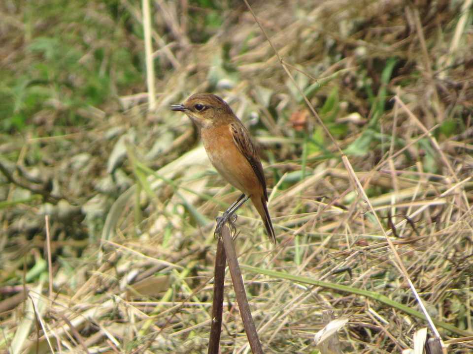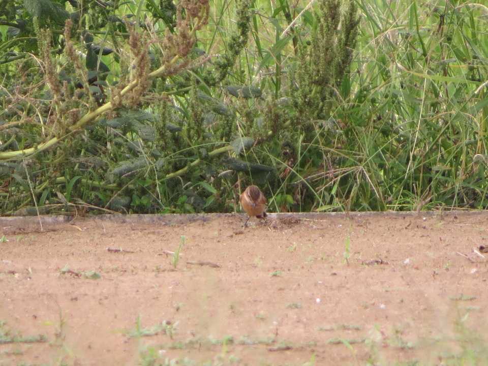 先月22日に手賀沼沿岸でノビタキを観察しました。どうしているかと現地を訪ねました。台風23号が太平洋を通過している影響で時折5m程度の風が吹き抜けていましたが、ノビタキは健在でした。外来種ヒレタゴボウ、セイタカアワダチソウなどの近くの草などに止まり昆虫をフライキャッチする個体、強い風をさけてフラットな農道で餌探しをする個体と実にさまざまでした。草などに止まっている姿を観察していると、脚の上部についている筋肉で腱がぴんとはられ指は閉じています。このため、強い風が吹いても飛ばされることがありません。(地上で立っている時は腱が伸びて指は開いています)今日訪ねた際には、上空にハヤブサが登場した際には、上空を注目し今は飛び立たない方が得策と判断したのか、草むらの中に潜みました。アップしたノビタキの写真は、喉が白いこと、腰が赤褐色、体下面が濃い橙褐色であり、雌第一回冬羽と思われました。それ以外も強風を避けて畔近くで羽を休めていたのは、トビ、ヒバリ、アオサギでした。(本日観察できた鳥類)コブハクチョウ、カルガモ、キジバト、カワウ、ダイサギ、コサギ、トビ、コチョウゲンボウ、ハヤブサ、ハシボソガラス、ハシブトガラス、ヒバリ、ヒヨドリ、ノビタキ、スズメ(写真)2025年10月13日撮影