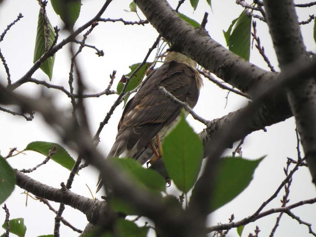鳥友の町でカラスの古巣で誕生しヒナ5羽は23日にはすべての幼鳥が巣立ちました。8日に幼鳥1羽を観察して以来、姿をみかけなくなり営巣林外での生活がスタートしたと思われます。営巣林近郊の桜並木でオナガが捕獲した餌を横取りしようと幼鳥がオナガを追尾している姿を目撃しました。オナガは、原田(2009)が報告しているように、雑食性で動物では昆虫、両生類、植物では樹木や草本の果実や種子を主に食べることが知られています。ツミの主な餌はスズメなどの小鳥ですが、飛翔するセミ、カブトムシを捕食することもありオナガが昆虫類を捕食したすると、それを目当ての追尾していた可能性が考えられます。オナガは、ツミにカラスからの襲撃や巣とヒナの防御をしてもらう代わりにツミの巣やヒナに接近するカラスを追い払う行動をとることが知られています。しかし、営巣林での繁殖が終了後し、幼鳥が営巣林外で生活するようになってもその協力関係が続いていることをはじめて目撃しました。一枚目の写真は、ヨソメイヨシノの枝にツミが降り立ったシーンです。何度もオナガを追尾しては枝に止まるのですが、撮影した画像はいずれも頭部、顔の部分が枝に隠れてしまい思うような記録がかないませんでした。しかし、上面が褐色で羽縁にバフ色があることなどの特徴から先月31日に地面に降りて餌を物色していた個体とよく似ています。(写真)1枚目:2025年9月12日撮影、2枚目:2025年8月31日撮影、オナガ:2025年9月8日撮影(引用)原田俊司.2009.オナガ 食性と採食行動.Bird Research News Vol.6 No.6.p3.