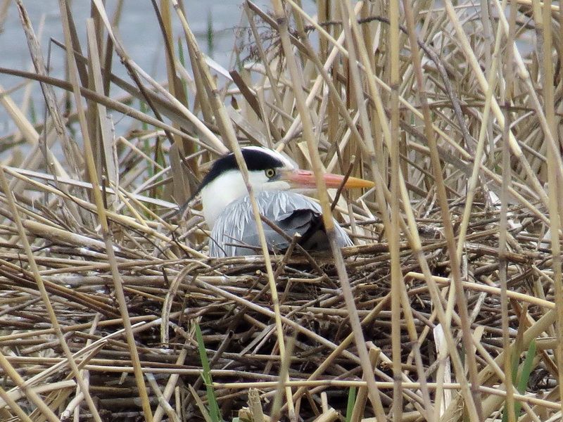 沼の葦原でアオサギが営巣し巣に座り込んで、産卵したのではと思われる光景を目撃