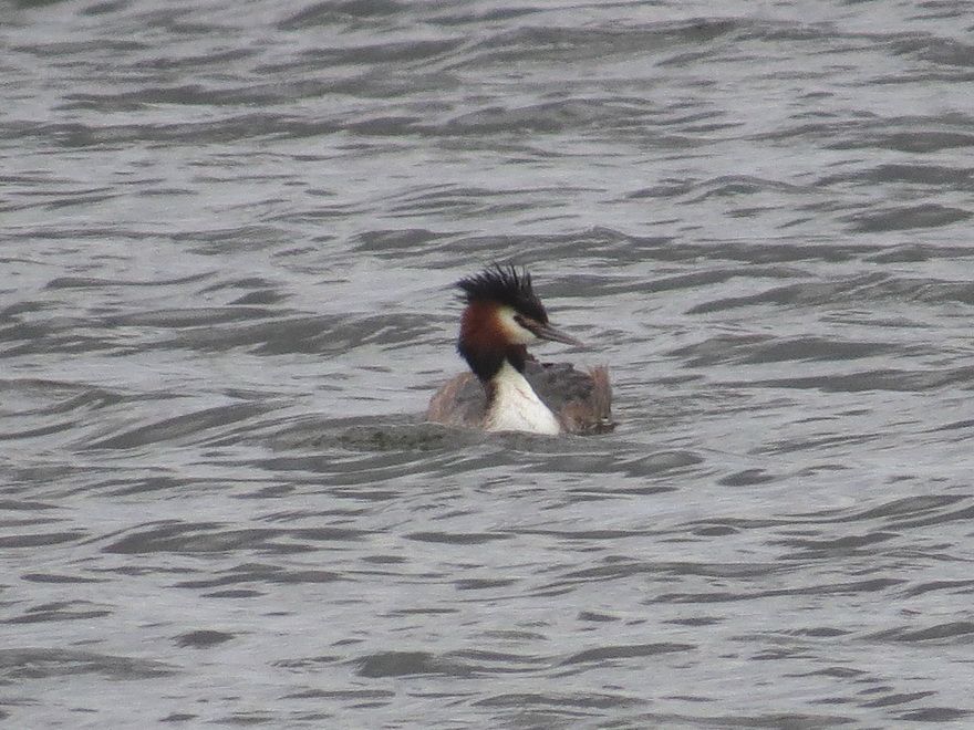水面を移動していた繁殖羽のカイツブリ、カンムリカイツブリ、羽縁が橙褐色に色づいて