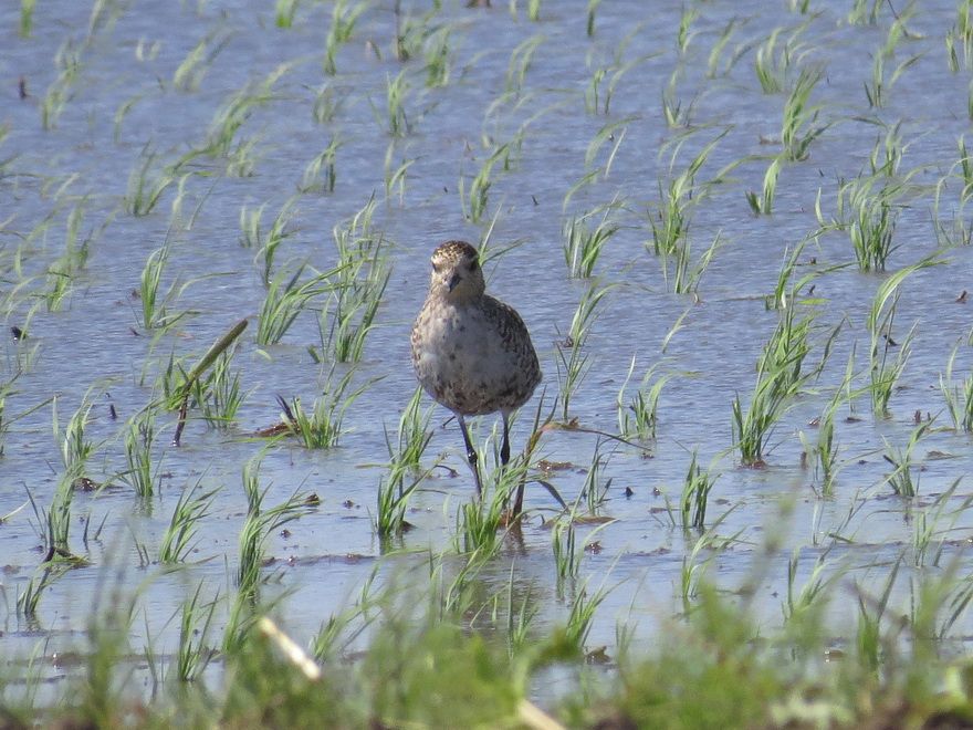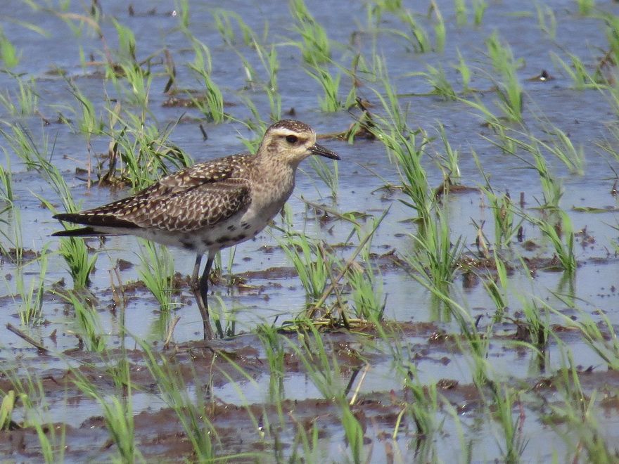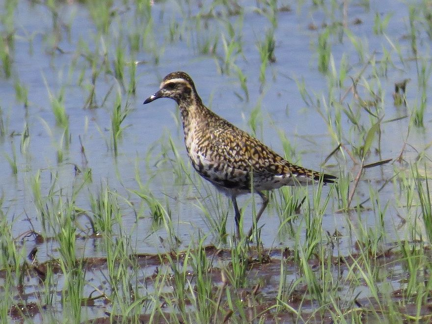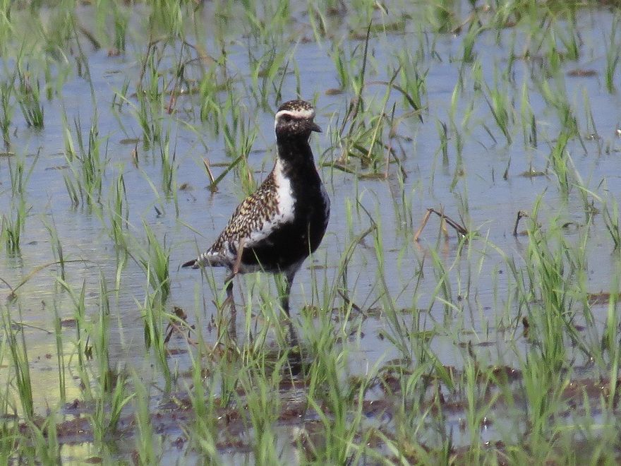 水の入っている田んぼで餌を物色していたムナグロの羽色をじっくり見ていくと