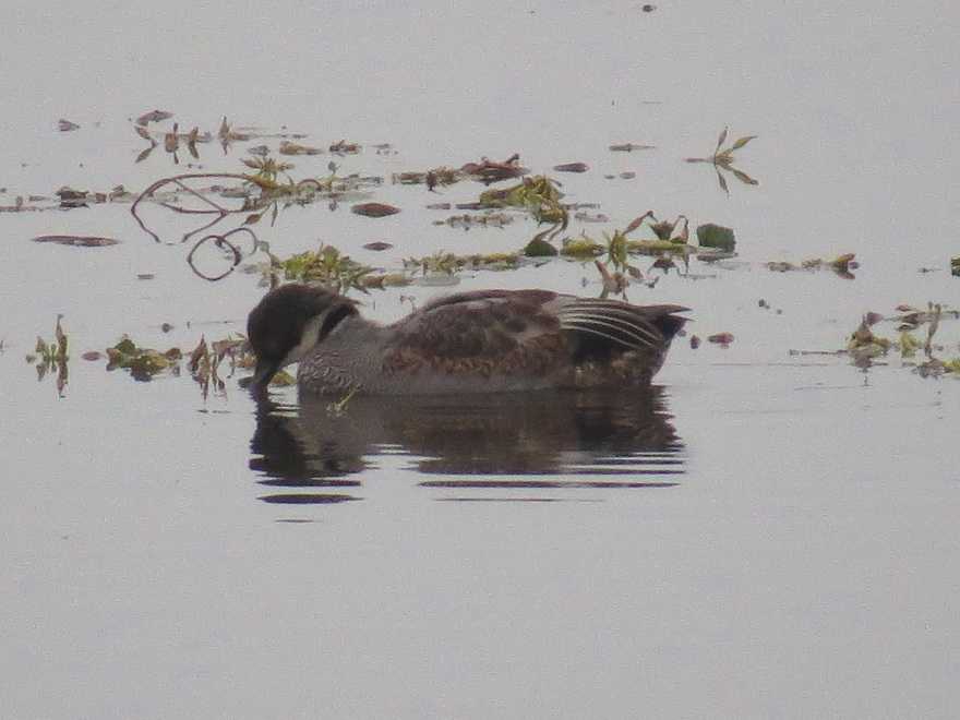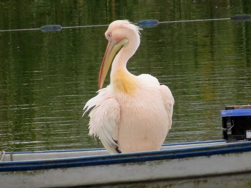 帰路、近郊の印旛沼に立ち寄り、モモイロペリカンのカンちゃん、水面を群れで