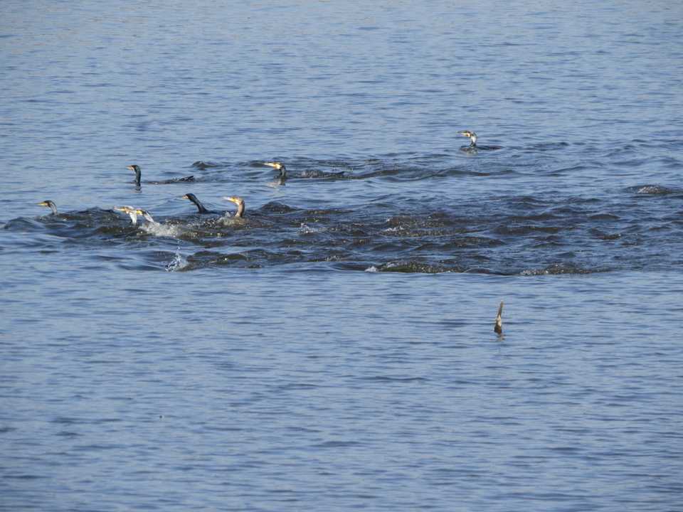 アップした写真は、下沼の葦原近くで休んでいたツルシギ、カワウの群れが追い込み漁