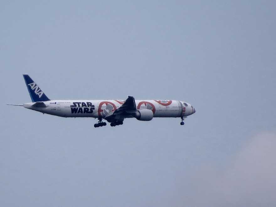 (キャラクター「BB-8」をデザインしたボーイング777-300ER型機)を発見。