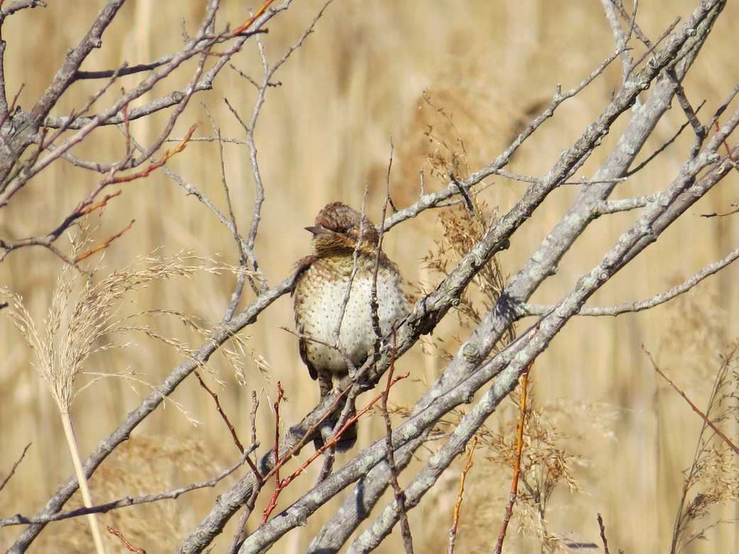 双眼鏡でみると頭から背が灰褐色、下面に横斑があるのがわかり、アリスイと判明。