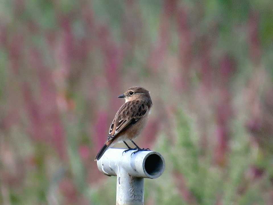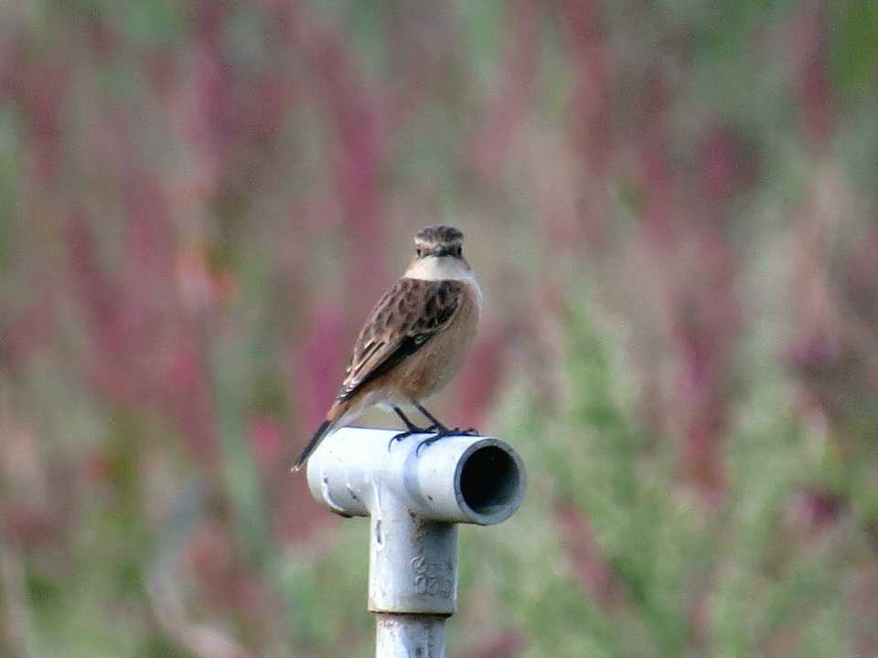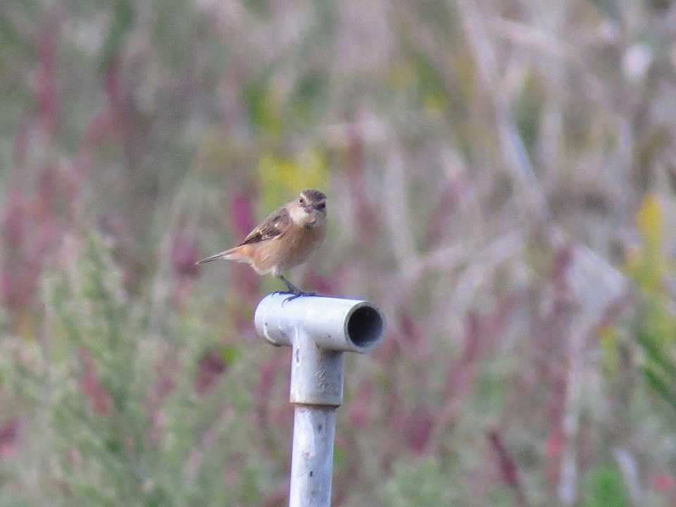 この時期になるとノビタキの背景にアサザのピンク、セイタカアワダチソウの黄、