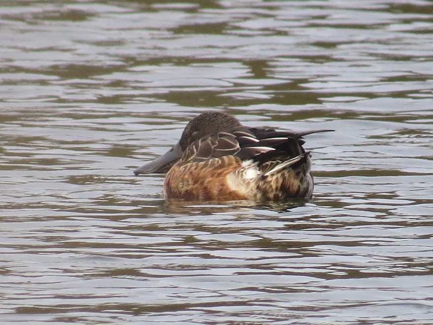 マガモ雌は、不明瞭な過眼線があり、嘴が橙色で、脇や肩羽に丸みがあるので