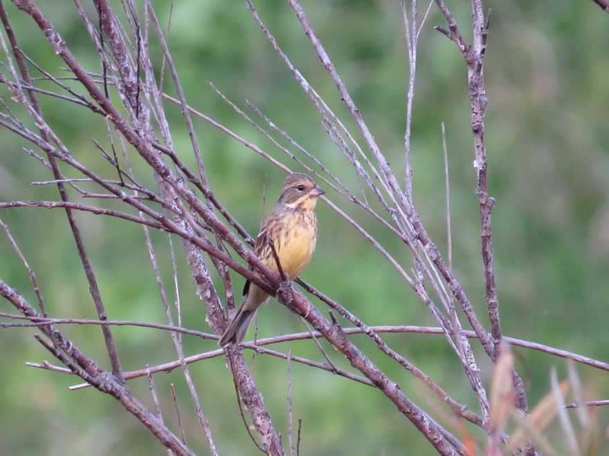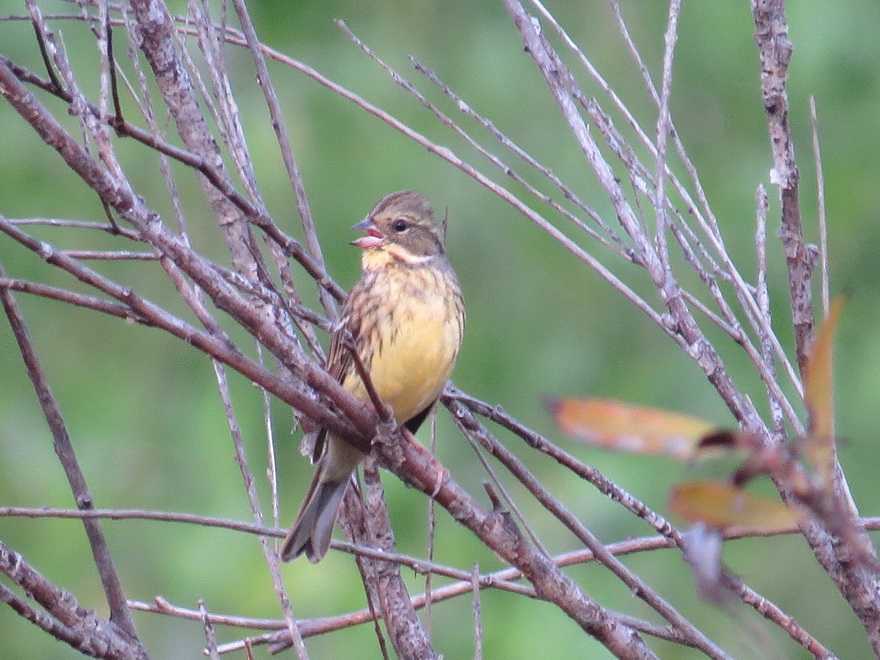 ・アオジ:成鳥と比べると淡色で目の上後方の側頭線と顎線が黄色味がかっており、