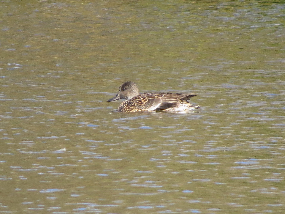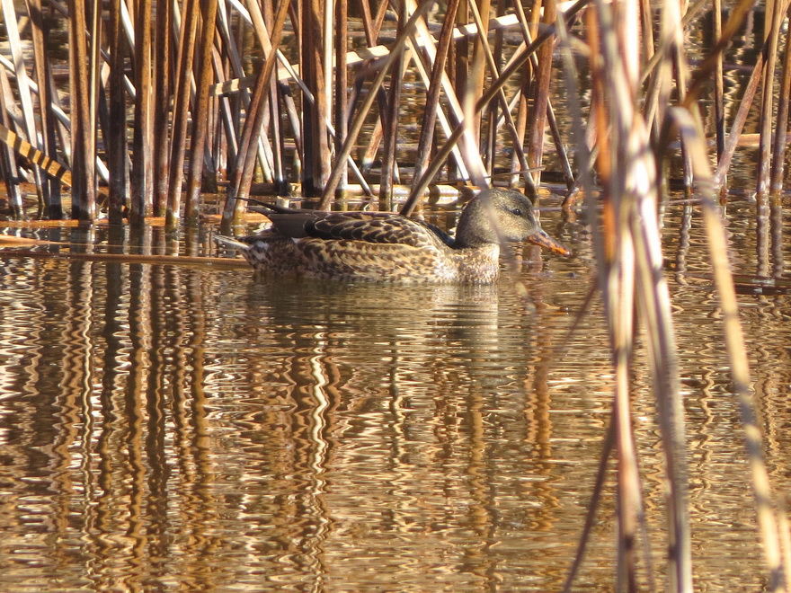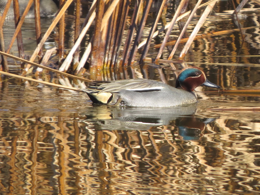 コガモが次々に登場。このほか、ススガモ、キンクロハジロとススガモの交雑と思われる個体が水面を移動する姿を発見。