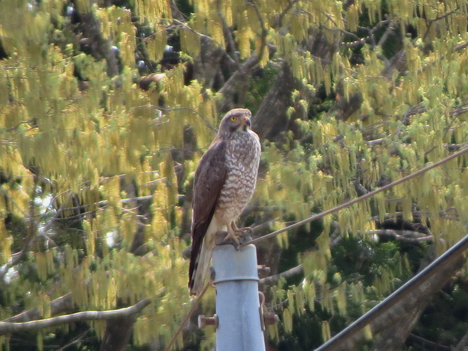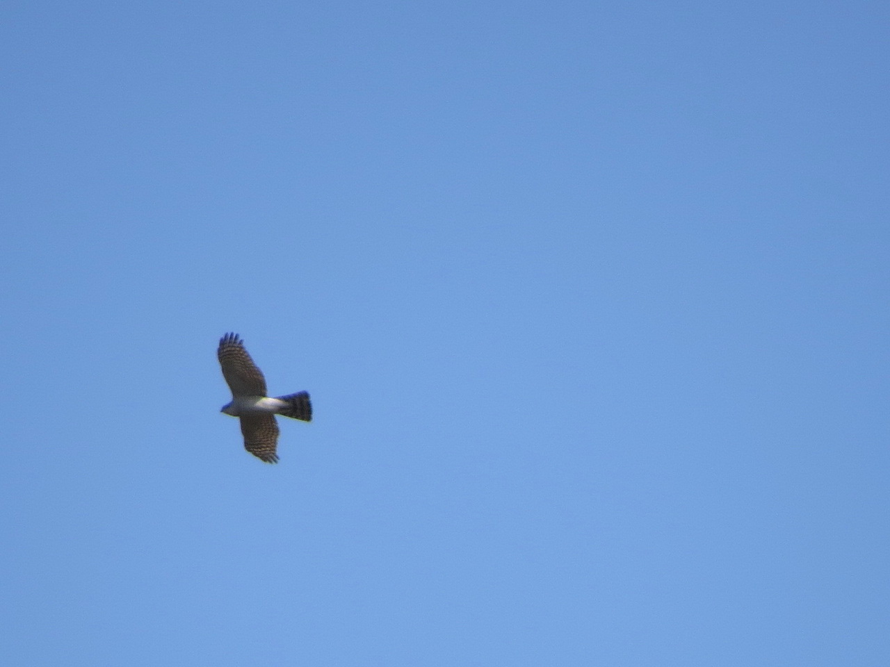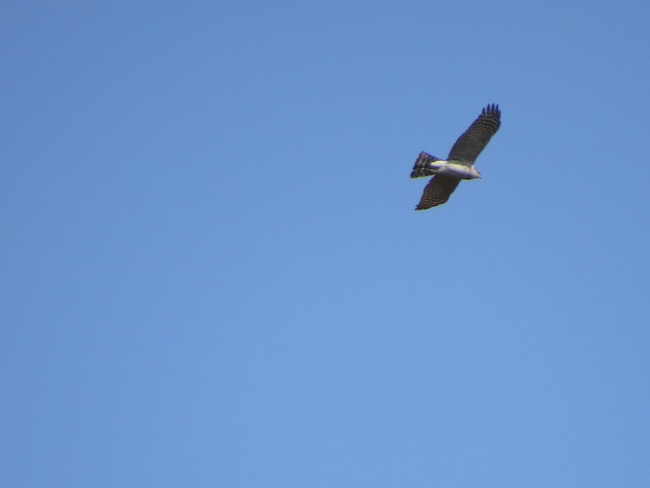 このほか、オオタカが飛翔し登場し、その姿を観察していると、上空を喉から腹が白く横斑があり、尾に4本の黒褐色帯が見えました。