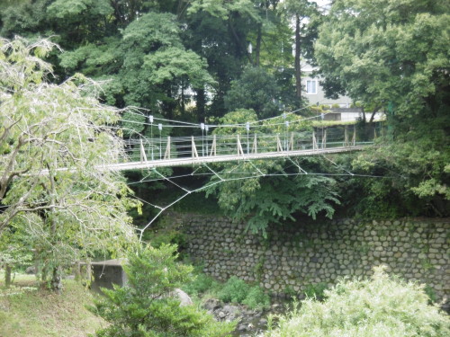 自然のある公園を探して散歩している 今日この頃です。吊り橋を探して公園をみつけている訳ではないのですが、あっちこっちの吊り橋を渡っているので高い所の苦手な私も、普通に渡れるようになりました。この公園の吊り橋は 渡り終わると また、吊り橋がありました。吊り橋の下はちょろちょろと流れる小川があり、その小川の周りも遊歩道になっていました。池もあり、もみじがありました。紅葉時期に来たらきれいでしょうね。この公園の周りには美術館がいくつかありました。遊歩道の手入れも良く行き届いて、歩きやすい所でした。今日の2時ごろから散策しましたが、この公園は 歩いている人も結構いました。
