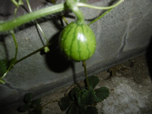 ベランダで出来た西瓜です。スーパーで買ったスイカを食べた後の種を植木鉢に植えてみました。ちゃんと芽が出て可愛い実がなりました。食べられる実にならないでしょうね。でも可愛いでしょ。。あの、この手と足は夫のです。