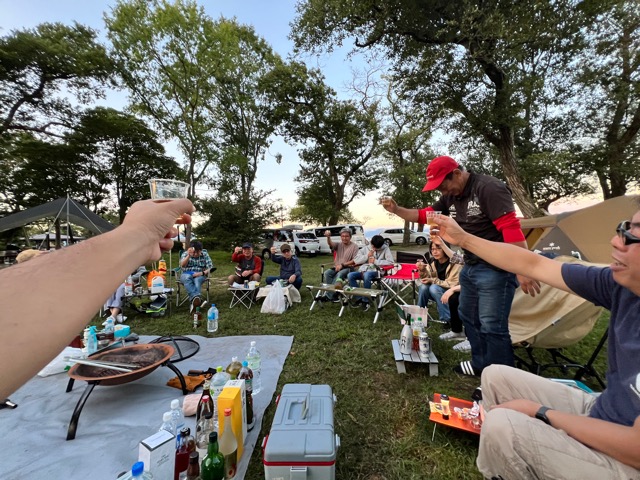 近くのドラッグストアでお酒とあじゃぶさんのお使いを済ませキャンプ場に戻ると、また数名旅仲間が到着していた。
