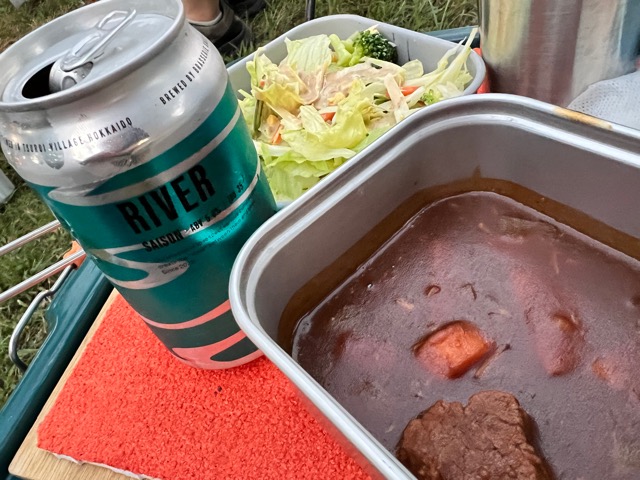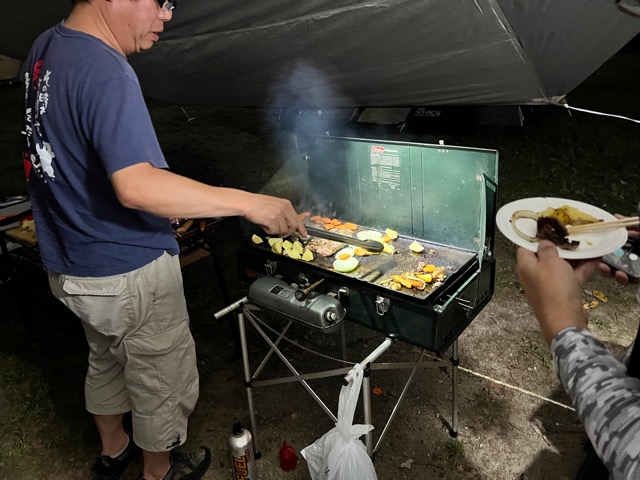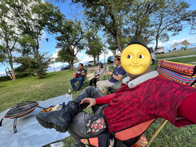 あじゃぶさんとともにタープを建て、荷物を降ろし、椅子を広げて、あじゃぶさんは水分補給開始(アルコール)。