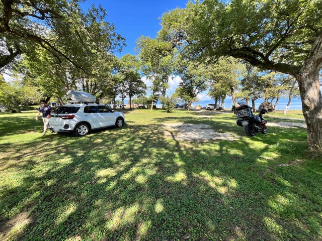 渋滞を掻い潜りつつ、12時前に琵琶湖畔の六ツ矢崎浜オートキャンプ場に到着。