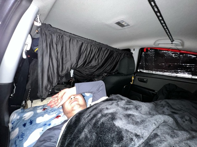 慣れた手つきで車中泊の準備を終わらせ、眠りにつくのであった。