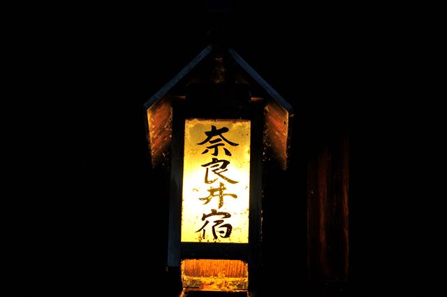 軒先に下がる「奈良井宿」と入った電灯がとても美しい。