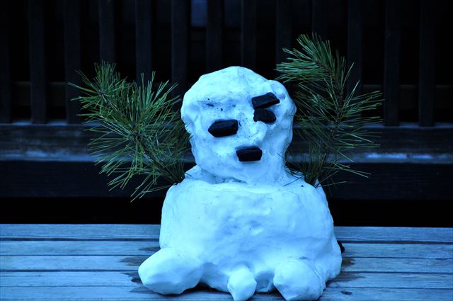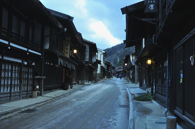 木曽路は路肩に雪が積まれ、山の木々は葉を落とし、その地面は白く雪化粧の粧い。