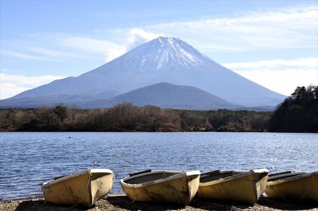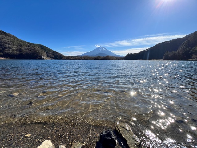 昼の本栖湖は早朝とはまた雰囲気が違い、順光で照らされた富士山の岩肌がよく見え、その下に満々と水を湛える湖がある。