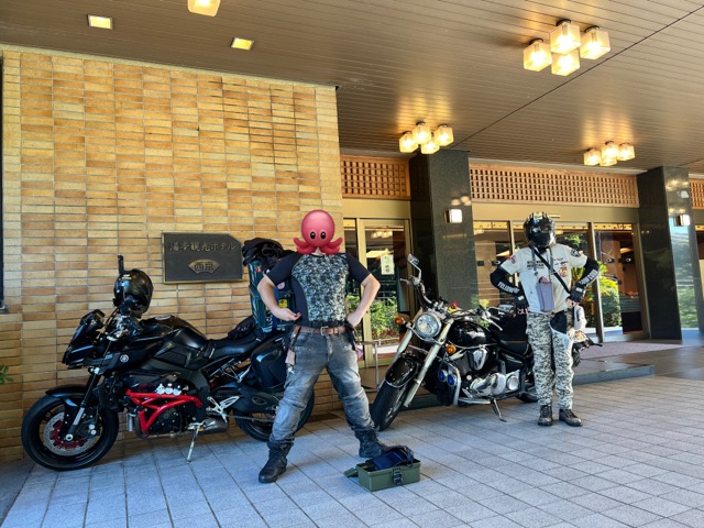 今回はO姐さんリクエストツーリングです。O姐さんのリクエストはいくつかありまして、今回はその中の一つ、山口県の角島大橋を目指します。それでは出発。初日は台風の影響で天気が安定しない。時折雨がぱらついたり、まとまって降ったり。O姐さんは全身カッパマンで対策してましたが、かずやんは全身ずぶ濡れとなりました。そうそう、今回のツーリングに備えて、気化熱冷却ベストなんてものを買ってみたんです。まあこれが役立たずで。気化熱冷却で冷えるよりも、体温と気温でベスト自体があっつあつに。保水層が熱を蓄えるものだから暑くてしょうがない。午前中でお払い箱となりました。さて、一行は順調に北上し、北熊本SAでお昼ご飯。真夏なのに冷たいメニューが一切なく、O姐さんはパンを、かずやんはタレカツ丼をいただきます。さて、休憩していると山鹿方面から雨雲が流れ込んでくるとあるではないですか。すぐに出発すると、山鹿方面に雨柱が見える。あれに降られてたらえらいことになっていたな。そのまま北上を続け、太宰府を過ぎたあたりで事故渋滞4kmに捕まる。なんとか渋滞を抜け、すぐ近くにあった須恵PAで小休止。ちなみに気温は40度近く。もうね、この時点で今日の予定を全てキャンセル。宿に直行することにしました。再び高速に乗り古賀SAで給油。そのまま北上し、めかりPAで関門海峡大橋を眺めます。去年の関西ツーリング以来だな。そして九州脱出。一路今日の宿がある長門の湯本温泉へ。夕方5時前に無事到着。お宿は湯本観光ホテル西京です。老舗の観光ホテルでいい感じ。バイクは玄関先に止めさせてもらいました。先着2台だそうです。今日バイクの客は私たちだけとのこと。ありがたく停めて、荷物をあげ温泉へ。さっぱりしたところで晩御飯は1階の居酒屋で済ませます。ここの料理がレベルが高くだいまんぞく!ごちそうさんでした。しかしこの宿は昭和と平成の間で時間が止まったかのようだ。ボーリング場にゲーセン。カラオケルームにスナック(みたいなとこ)まである。しかも全部お客さん入ってるし。賑わっているのはいいことだ。私たちは暑さで疲労困憊でしたので、そのまま休みます〜。ではまた明日。2日目に続く。