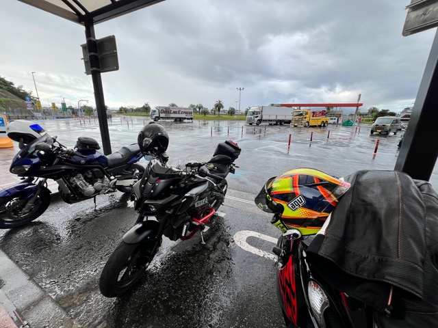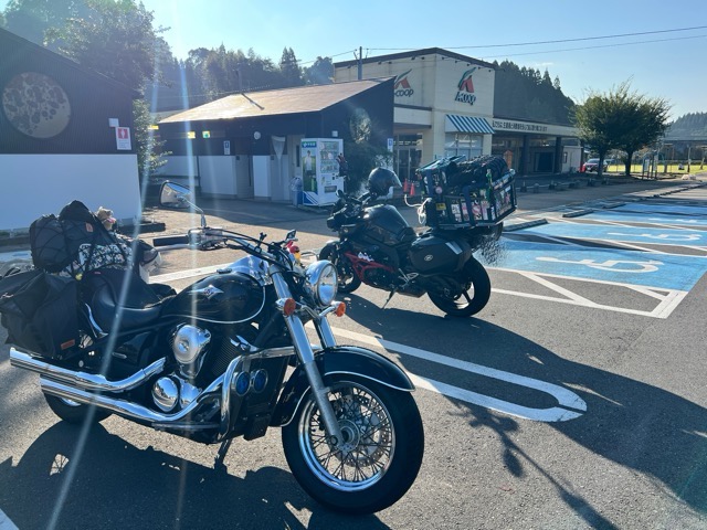 朝5時起床。ツーリングなのに、普段の生活リズム(社畜)は抜けないようだ。天気予報を確認するついでに四国カルストのライブカメラを見てみるが、見事なまでに雲と霧の中。なお、これを書いている今の段階で、晴れたのは1日だけのようであった。この時期の四国カルストは無理ゲーなんじゃ・・・。時刻は6時過ぎ。朝食バイキングを姐さんといただきながら今日の相談を。雨に降られることはなさそうだけど、疲れているのであまり寄り道せず帰路に着く案に決定。準備を済ませ出発しようとすると、おばちゃんに声をかけられる。話を聞くとご近所さんであることが判明。世間って狭いね。おばちゃんはこれから小倉に向かい、博多から新幹線で帰るそうな。おそらく我々より早く帰り着くだろう。おばちゃんに見送られて出発した。バイクスタンド敷きを忘れて・・・。別府の急峻な坂道を登り、別府インターから高速に乗る。この時点で霧で煙っていたが、大丈夫だろうと走り続ける。そして直後、強い雨に見舞われ、視界も50メートルもないほど悪化。たまらずPAへ逃げ込んだ。天気予報も台風の影響でその精度を落としているようだ。さて、ここの目の前には素晴らしい温泉塚原温泉があるのだが、さすがのこの天候の中、あの激坂を登る勇気はない。後ろにポン酒も満載しているので、荒れた路面も避けたいところ。とりあえず雨宿りするも一向に止む気配がない。それどころか、あと数分すると土砂降りになると予報が出ていた。仕方ない、小雨になるタイミングで出発しよう。ふたりはカッパも着ずに走り出すのであった。「暑い暑い!!」雨降りのPAから脱出したふたりは、九重インターそばのセブンにやってきた。ここまでくると先ほどまでの雨が嘘だったかのように晴れ渡る。そしてとてつもなく暑い。湿度も加わり灼熱地獄である。休憩もほどほどに山に逃げるように走り出すのであった。峠道に入るととっても涼しい。つづら折りの道も最高に楽しい。中国語、韓国語、英語が混ざり合う不思議な空間。しかしやはり日本語の割合が圧倒的に多い。そんなカオスな空間が広がる、くじゅう夢大吊橋にきていた。かずやんは何度か訪れているが、姐さんが来たことがないとのことでやってきたのだった。ここは紅葉が最高らしいのだが、9月の中頃で紅葉はまだまだ先の話である。しかし先日までの雨のおかげで、雄滝・雌滝の水量が多く美しい。あまり揺れない吊橋を渡り対岸に出る。展望台が見えたがえらい高いところにあり、満場一致で戻ることに。吊橋を渡り終えたところでお腹が減ってきた。時刻は11時過ぎ。近くでランチを検索し、たどり着いたのが坊ヶづる庵。ここでとり天うどんをいただく。ここのうどんは米粉で作っているとのことで、あっさりしていながらずしっと重い麺は腹持ちが良さそうだ。とり天も柔らかくサクサクに揚がっており、とても美味しい。そしてなにより看板犬のヌーが大人しくてとってもかわいい。また来るから元気でな。体を包み込む風。ススキが穂を出しているが、まだその色を失わない草原。やまなみハイウェイを南下してゆく2台。ここは何度走っても気持ちがいい。やまなみハイウェイから外輪山を越え、阿蘇谷に降る。そのまま阿蘇駅方面へ。すると今通ってきた一ノ宮あたりに雨が降っているのが見えた。阿蘇神社に参拝していたら降られたとこだ。雨雲をうまく避けつつ到着した菓心なかむら。お馴染みの坊中の石畳を食べていく。相変わらずサクサクな石畳は、何度食べても期待を裏切らない。さて、時刻は13時過ぎ。さすがにそろそろ帰らなくては。近くにファミマで水分補給をしていると、雷鳴とともに真っ赤な雨雲が接近しているのを雨雲レーダーで確認する。大慌てで出発し、一気に道の駅大津までやってきた。阿蘇から下界に降ると暑い暑い!それでも吹き抜けていく風は秋を感じさせるものであった。休憩を終え、渋滞を回避しつつ益城インターから高速へ。しかしこの時点で疲労困憊な2人。SAやPAで休憩を取りつつ南下していく。しかしこれが大正解で、うまく雨雲を回避することができた。最後の休憩、溝辺PAでは目の前を雨雲が通り抜けていく。ここで止まらなければ、あの雨雲に突っ込むところだった。雨雲が去るのを待ち出発。そのまま自宅近くまで南下し、そのまま解散となった。今回は1番の目的であった四国カルストを初め、四国を満喫できずに終わる結果となった。これは単に今回は呼ばれなかったということと、また来いという暗示なのだろう。今回は仕事疲れが抜けずに強行したため、無理に行っていたら事故をしていたかもしれない。もしくは途中で体調を崩していたかもしれない。今回の体調では、この走行距離が1番良かったのかもしれない。佐賀関港からフェリーで渡る旅も初めての経験で、色々とコツも掴んだ。次の四国ツーリングでは、もっと快適で楽な旅が送れると思う。そう考えながら次の旅に思いを馳せる
