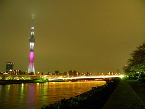 この間の日曜日、散歩に行った奥さんから電話がかかってきて、桜橋がすごく綺麗というので見に行ってきました。^^橋の照明を取り替える工事をしていたのは知っていましたが、終わったみたいです。橋の照明が川面に反射して、とても幻想的です。^^スカイツリーも特別ライティングです。^^手前は色が良くないけど桜ですよ。^^;