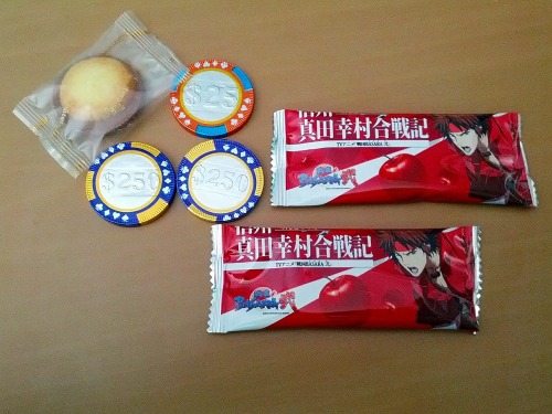 今朝、会社に行きましたら、なにやらお菓子がいっぱい。^^右の「真田雪村合戦記」は、長野から戻ってきた同僚にもらいました。コインの形のお菓子は、ラスベガスに行っていた同僚からのお土産です。一番左上のクッキーは…なんだったかな?^^;コインが余りに精巧にできているので、もったいなくて食べられません。