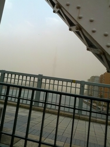 今日のは「黄砂」じゃなくて「煙霧」という現象で街が霞んで見えたそうですよ。つまり埃が舞い上がった状態なんだそうです。だからいつもは良く見えているスカイツリーも。。うっすらと見えているのが分かりますか?