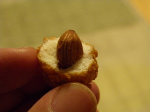 今日は知り合いの方が家に来てくれたのですが、お土産に赤坂柿山のおかき、あられの詰め合わせを持ってきてくれました。その中に一個一個丁寧に袋に入れられた歌舞伎揚(赤坂慶凰というらしいです)がありました。食べてみると、中に何かが入っている様子。食感と味から豆(節分で使う豆)かなと思いましたが、半分だけかじって中身を見てみると…。なんとアーモンドでした。^^;一緒に食べた奥さんも豆かと思ったと言ってましたよ。