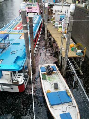 桜もそろそろ葉桜の割合が大きくなってきましたね。下の写真は神田川。川面に桜の花びらが集まっています。そしてこちらは隅田公園。4月19日の流鏑馬の準備が始まりました。流鏑馬の様子を解説するやぐらが立ちました。