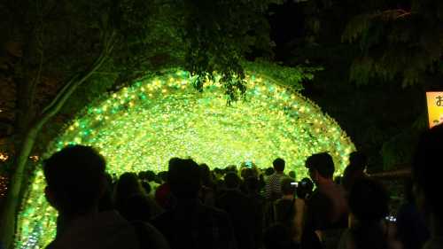 最後です。アンパンマンの花畑を抜けると、今度は100メートルの光のトンネルに入ります。200メートルの光のトンネルは暖かい色でしたが、こちらは緑と黄緑のトンネルです。こちらは色が変化するですよ。良く見てみると緑のLEDにピンクのLEDが混じっているようですね。トンネルを抜けると鏡池が見えます。水面が静かで鏡のようですよ。さすがナガシマリゾートの一部だけあって、鏡池の向こう側には「里の湯」という温泉施設もあります。充分に堪能したのと、帰りの電車の時刻が迫っていたので、この後東京に向かいました。なばなの里の入場料は1,600円ですが、1,000円の金券付きだったので実質600円でした。なばなの里は中京地方以外ではあまり知られていないようですが、なばなの里を含むナガシマリゾートは日本屈指の遊園地、プール、植物園、温泉、宿泊施設なのです。ちなみに遊園地のナガシマスパーランドは、入場者数で世界第18位、日本だと4位だそうです。機会があったらぜひ行ってみてください。^^