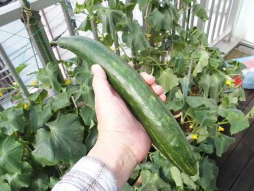 ここ最近忙しくて全然キュウリを見ていなかったら、奥さんが実が成っていると教えてくれました。初収穫のキュウリ!結構デカいです。^^枝も茂りすぎていたので適当にカットしました。風通しも良くなったようです。^^