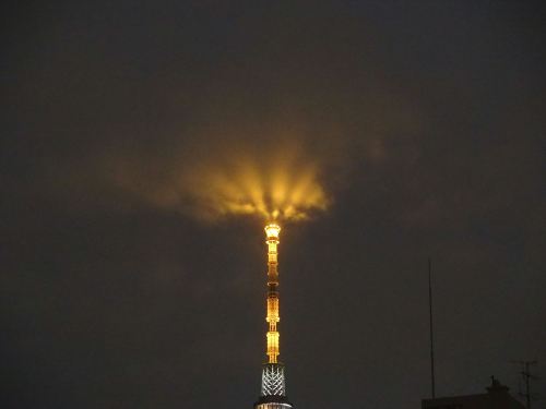 昨日のことですが、スカイツリーのすぐ上の雲に塔頂のライトが当たっていて、とても幻想的でした。本当はもっと綺麗だったのですが、カメラを取りに行った30秒間でライトの状態が変わってしまい残念でした。