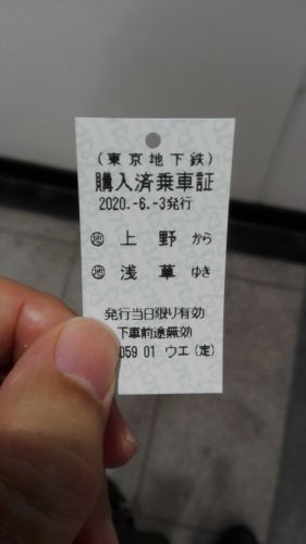 先日、通勤定期券を払い戻してきました。在宅勤務のため、4月から現在まで3回ぐらいしか出勤していなくて定期券がもったいないと思ったからです。^^;東京メトロの場合は、ここに案内の文書が載っていますね。通勤定期券についての部分を引用しますね。緊急事態宣言を事由に、通勤定期券及び大学生等の通学定期券を払戻す場合、実際のお申し出日にかかわらず、お申し出日を遡って払戻しいたします。・2020年4月7日(火)以前に有効開始となる定期券の場合、2020年4月7日(火)をお申し出日といたします。ただし、2020年4月8日(水)以降に使用した場合、最後に使用した日をお申し出日といたします。浅草駅では払い戻しができなくて、定期券売り場のある駅に行って手続きして欲しいということでしたので、上野駅で払い戻しました。写真は帰りの切符です。往復の運賃はもちろん無料でしたよ。^^