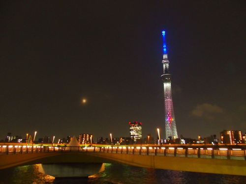 今夜は満月でした。残念ながら少し雲が出ていてぼんやりしています。スカイツリーは思いっきりおめかししているのに少し残念でした。