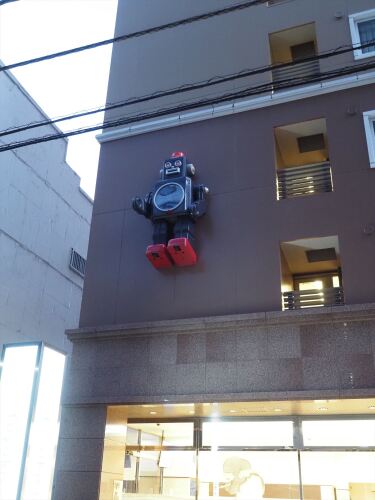 ここは蔵前。ビルの壁にロボットが貼り付いています!これはいったい!?実は東横イン蔵前なのです。この近くの浅草橋には、ロボットが接客する「変なホテル」がありますが、ここは人間が接客します。ロボットがモチーフになっているのは、おもちゃの街「蔵前」にかつてあったおもちゃ倉庫を偲んでのことだそうです。(今でもバンダイやエポック社がありますね)