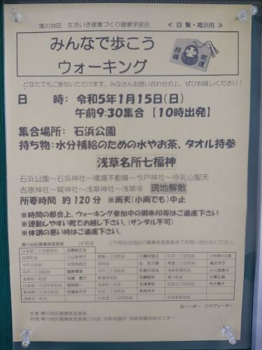 来週の日曜日にウォーキングの催しがあるようです。コースは、石浜公園をスタートして、石濱神社、橋場不動尊、今戸神社、待乳山聖天、吉原神社、鷲神社、浅草神社、浅草寺の約2時間のコースです。これに矢先稲荷神社も含めていれば、浅草七福神の完成だったのですがね。そういえば、今日テレビ朝日の「東京サイト」で浅草名所七福神を放送していました。今日は、待乳山聖天、浅草寺、浅草神社の3カ所の紹介でした。明日と明後日も放送があるので宜しければご覧になってください。放送は、木曜日と金曜日の13:45からです。