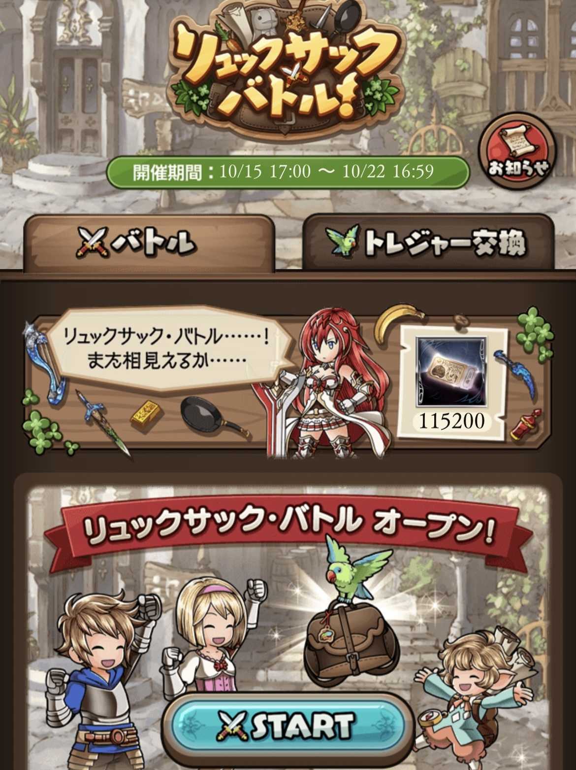 10/15(水)から、リュックサックバトル復刻らしい!わーいあれ楽しくてまたやりたいと思ってたから嬉しいなグラブルはなかなか欲しいアイテムが落ちないし面倒であきてたからちょうど良かった今やってるイベントのアグ兄とか出てるからみたけど今回も泣いた泣いた