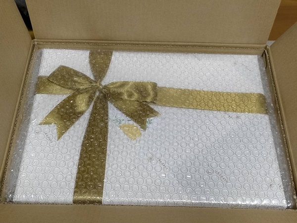 プチプチに包まれたラッピングされ箱に入った商品です。
