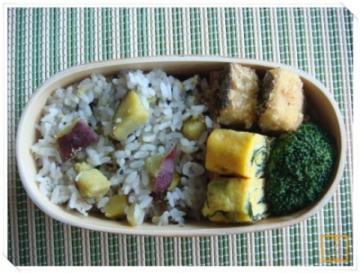 お家で食べる 自分用お弁当 ☆ おいもご飯(黒ごま) ☆ 鯖唐揚げ(カレー味) ☆ たまご焼き(わかめ) ☆ ブロッコリー 写真の色 悪っ でも おいしかったから byうに丼