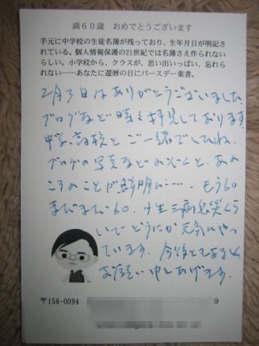 誕生日に同級生から一通のハガキをいただいた。名づけて還暦バースデーハガキ。 青インクでの肉筆メッセージに、当時の出会いから今に至るまでの場面が思い浮かんでくる。 考えてみれば、中学高校と同じクラスになったことがなく、学生時代はあまり言葉を交わしたことはないように思う。 あっ、そういえば一度だけ記憶に残っていることがある。高3の時、初めて競馬をやった時に、彼にたしか馬券の購入を依頼したはず。彼はその頃から競馬を愛していた。 そんな感じだったけども、、卒業後はクラスなどは関係がなくなり、いろいろな機会を積み重ねて、交流を徐々に深めていった。 暦が一巡したこの節目に、来し方この道を振り返るに、大変に良いきっかけとなる、このバースデーハガキに感謝。 一人ひとりへのメッセージの配信は大変だと思うが、とても面白い企画なので広がれば面白いのでは? しかしながら、個人情報保護法なる法律が跋扈している現在は、これをたてに、何かをするにもままならない時代背景があり、このようなことは行いにくくなってきている。その「個人情報保護法」の光と影を考えてしまう。 たかが一通、されど一通。 早速、コンビニに行って、ハガキを5枚ほど購入してきた。 付加価値の高い一通のハガキに、いろいろな思いを馳せた還暦誕生日になった。