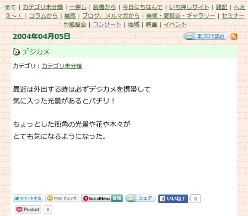 ブログを始めてから10年以上が過ぎた。思えばブログという言葉を初めて知ったのは日経ビジネスでの記事から。 アメリカでこんなことをして個人の意見をオフィシャライズしているという記事が目に留まり「ブログ」という概念がすぐにはつかめないまま、その聞きなれない言葉のみが記憶に残り、なんとなく気になっていた。 それからしばらくして日本にも上陸。いろいろな無料サイトが立ち上がった。ダイヤモンド異業種交流会で知り合った故Sさんから「楽天」が良いと言われ、このサイトを選んで始めた。 最初は何を書いてよいかわからずに数行、、、そのうちに日々生活していく中で無意識のうちにブログネタを探すようになっていった。併せて読書記録も載せるようになった。 このようなことが日々の生活自体にも変化をもたらした気がする。ブログネタ、発信ネタを求めて、ちょっとどこかに立ち寄るとか、本を読むとか、日々の中でちょっとした変化を求めるのを厭わなくなっていったような気がする。 また、ブログを活用している人も気がつかないうちにベンチマークして参考にしていたように思う。 ブログがもたらした生活の変化は日々わずかで目に見えぬものではあるが、歳月を重ねるとそれなりのものになる。 今、ネット上で言われている発信メリットの一つがこんなことではないかと感じている。 FACEBOOKなども同様のメリットがあるのだろうと推測している。 --------------------------------------------------------------------------元大学教授の、精魂込めた「燭楽亭」手づくりチョコ!--------------------------------------------------------------------------薬円台、いち押しのカフェ「シンシア」--------------------------------------------------------------------------「習志野防災かるた」が完成--------------------------------------------------------------------------「わくわく習志野」リニューアル版をアップ--------------------------------------------------------------------------足で拾ったビジュアル習志野情報--------------------------------------------------------------------------習志野の民話が形(本)になりました-------------------------------------------------------------------------- 銀座 「苗」--------------------------------------------------------------------------アクティブシニアネットワーク・習志野--------------------------------------------------------------------------夢こむさ習志野--------------------------------------------------------------------------