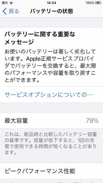 最大容量79パーセント、バッテリー交換の要ありと、