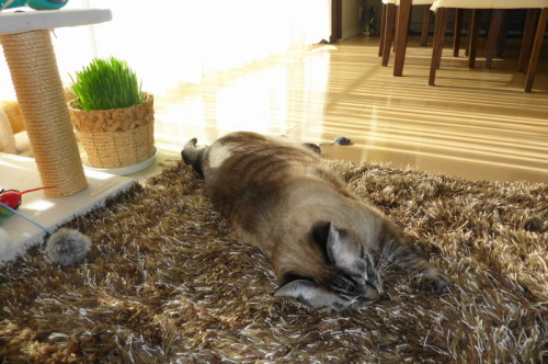 髪を結んだゴムを奪っていき...ゴム遊びを始めました。以前のおうちで使用していたマットを3年ぶりに出したらお気に入りだったことを思い出したように..スリスリしたり、掘ったり、寝転んだり...