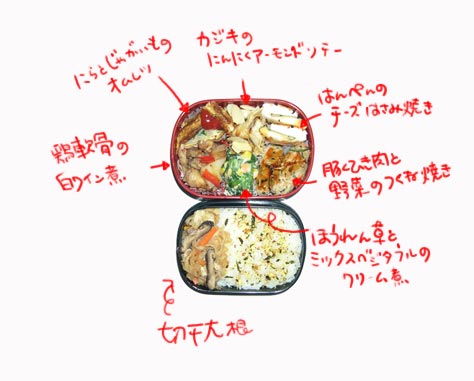 会社員の夫のために毎朝お弁当を作ってます。最初は節約のつもりだったのだけど、お弁当の食材ってマンネリ化しちゃうからついいろいろ試したくなり、気づけば意外と食費を圧迫してたりして?(汗)でも栄養面では結構自信アリ。。。かなァ?とりあえずバランスはいろいろ考えてます。考えすぎて時々頭の中が食材でぐちゃぐちゃになることもしばしばアリ…。^^; ちなみに夫のお弁当箱、男性にしては小さめ…。本人がどうしてもこのサイズにしてくれと言うので渋々買い求めましたが、どう考えても女性サイズ。仕方ないからいつも思いっきりギューギュー詰めで、振り回しても決して偏ったりはしません!(笑)朝は弱い私。毎朝時間がなくてかなり必死です。^^;でもお弁当づくりは楽しいです。夕食のおかずとかち合わないようにとか彩りや配置を考えたり、けっこう頭の体操になります。(笑)さて今日のお弁当は、 ・切干大根 ・豚挽き肉と野菜のつくね焼き ・鶏軟骨の白ワイン煮 ・かじきのにんにくアーモンドソテー ・ニラとじゃがいものオムレツ ・ほうれん草とミックスベジタブルのクリーム煮 ・はんぺんのチーズはさみ焼きでございました。おそまつさま~。^^~ちょこっとレシピ~豚挽肉と野菜のつくね焼き 豚挽肉50gにえのき半束を半分の長さに切り、 千切りにしたにんじん10g、ピーマン10g、 卵1/4個、味噌小さじ1/2、片栗粉小さじ1/2を加えてよく 混ぜる。しっかり練って3等分にし、ギュッと握って細めの俵型に。 アルミを敷いたトースター皿に並べオーブントースター(200度)で 8~9分位、焼き色がつくまでしっかり焼く。 オイスターソースをたらして完成。 ※このレシピは「カラフルお弁当」に掲載されていたレシピを アレンジしたものです。
